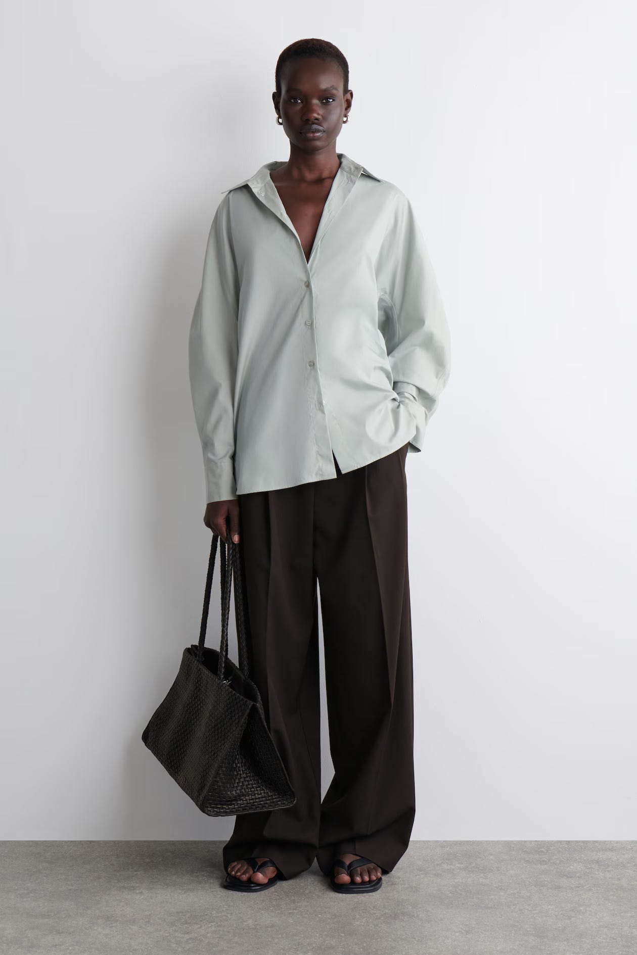 Comme Si brown shirt (S) | Donni black scallop pants (M) | Jcrew tote | Saint Laurent sunglasses | BAGGU shopping tote | Manolo Blahnik suede flats - similar