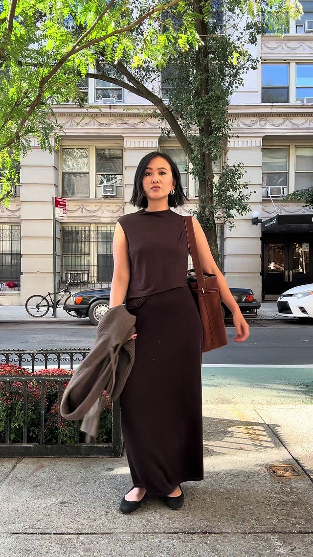 I styled it with an old slightly sheer brown sleeveless top from Paloma Wool. I had on a brown Skims bralette underneath and opted for a sweater draped over the shoulder look instead of a jacket (because it was not cold enough!). The suede belted tote is new-ish from Madewell, and I shared about it in last week’s vlog!!! You can shop the outfit, HERE.