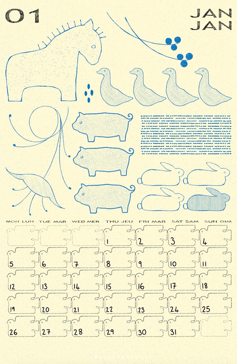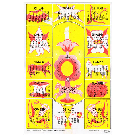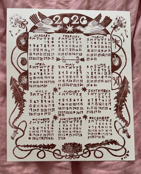 left: @natalie.briare 2026 lino calendar; middle: Aya Studio 2026 calendar poster; right: @mimodesigntat 2026 risograph calendar