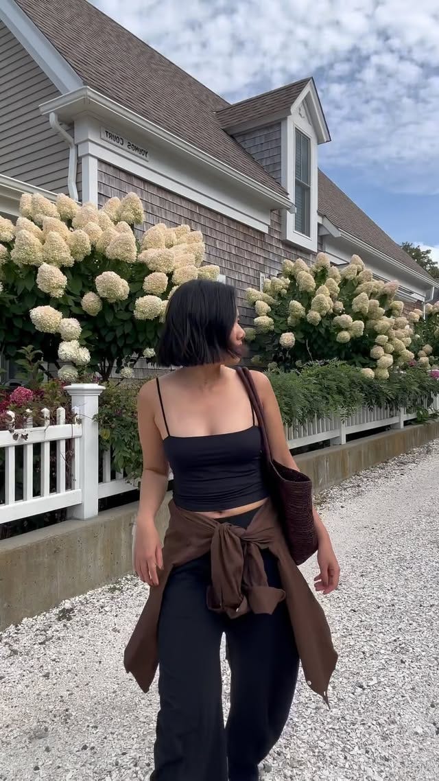 P-town outfit: Filippa K spaghetti tank (old - similar), Ruti pants (size 4, gifted), COS brown raffia bag, Undo red claw clip, Comme Si brown shirt (Size S), Emme Parson navy suede mules